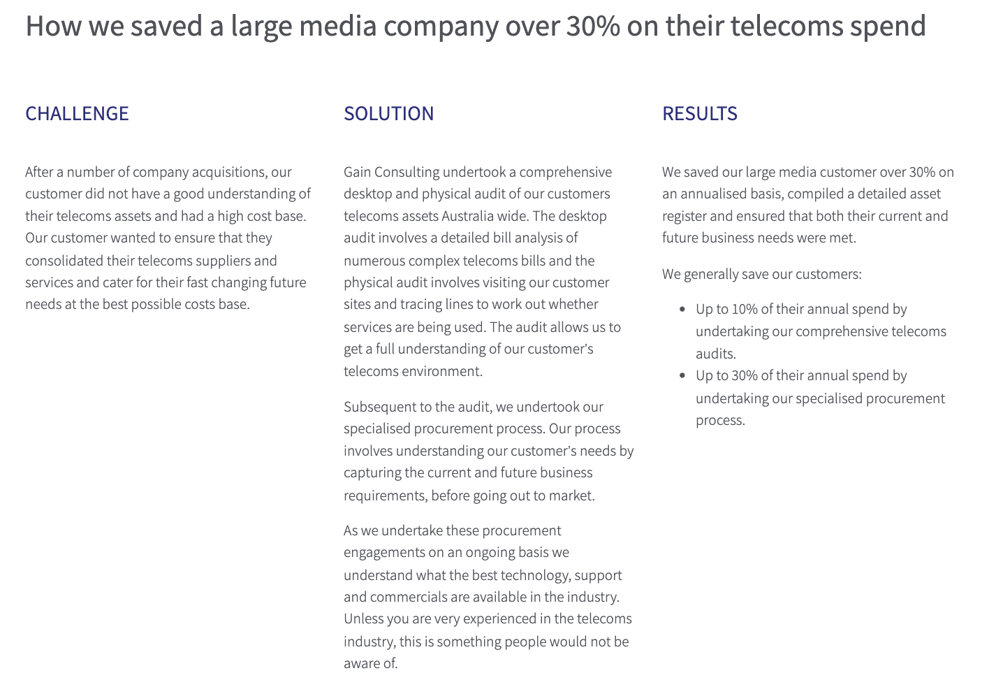 Founded in 2009, Gain IT & T Consulting is a specialiazed independent telecom solutions, contact centre & data centre consulting company working with large corporate companies, government agencies and telecom carriers and resellers. For example, we help companies get a full understanding of their telecom current state, future state and roadmap prior to undertaking any procurement engagement.