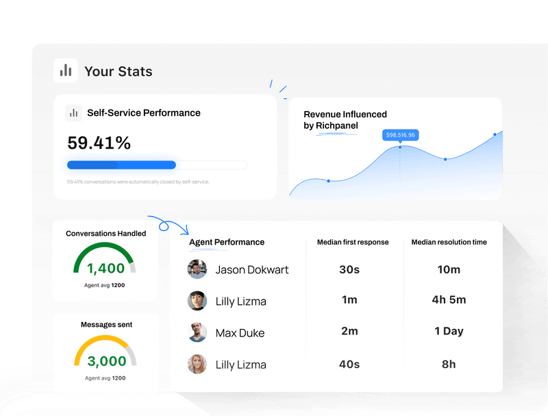 Understand the bottom-line impact of your customer service. Slice and dice your team’s performance metrics by channel, products, geography, and whatnot. Measure the impact of self-service and your customer support team on your revenue and customer lifetime value.